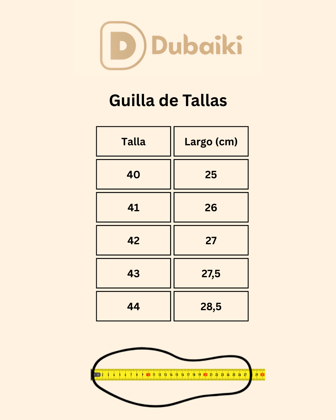Útiliza la siguiente tabla para conocer la talla de tu pie correcta para los Dubaiki Modelo Metro